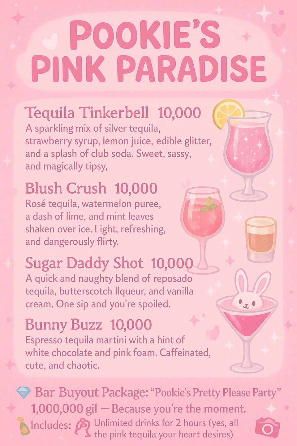 Welcome to Pookie’s Pink Paradise, a cozy, pink-themed haven nestled in the heart of Eorzea! Owned and lovingly run by Pookie Nima, this charming little club is all about soft vibes, sweet conversations, and a splash of sparkle. Whether you're here to unwind, make new friends, or simply bask in the glow of pink perfection, there's always a warm seat and a kind smile waiting for you.Hop in, get comfy, and let the pink magic take over~